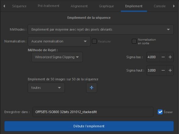 "Empiler x images sur x de la séquence" ne sera utilisé qu'au moment de l'empilement des LIGHT pour un dernier tri => voir ci-dessous. Pour le moment laissez sur "Toutes".