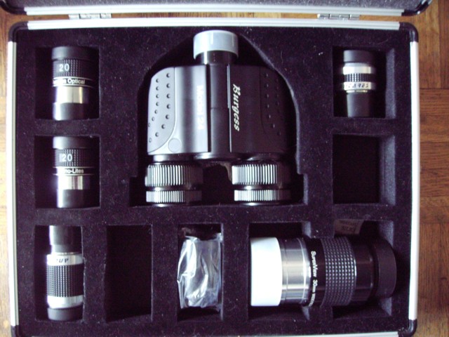 La BV24, deux oculaires Binolites 20mm (60°CA), une barlow 1,95x indispensable pour la mise au point avec un Newton standard, une bague permettant un accès plus aisé aux vis de serrage du PO: voilà l'équipement offert dans un coffret alu aux dimensions fort pratiques.