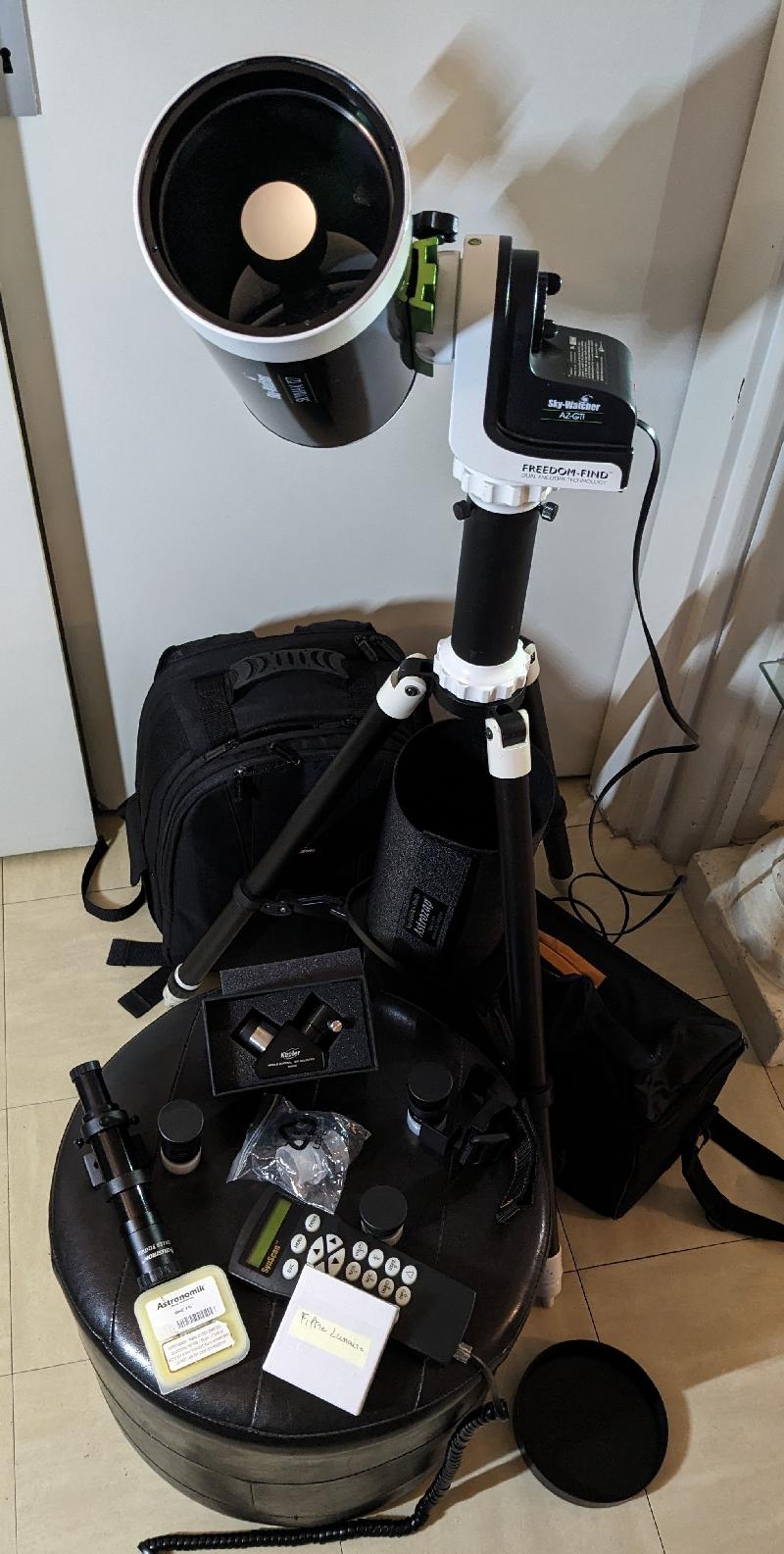 1 raquette Synscan pour le Go-To (câbles offerts) + 1 pare-buée + 1 renvoi-coudé de très haute qualité + 1 filtre UHC « Astronomik » + 1 filtre lunaire « Kepler » + 1 chercheur « Célestron » 6x30 + 4 oculaires + 1 sac de transport pour le Maksutov, + 1 sac de transport pour la monture Skywatcher et pour les autres accessoires.