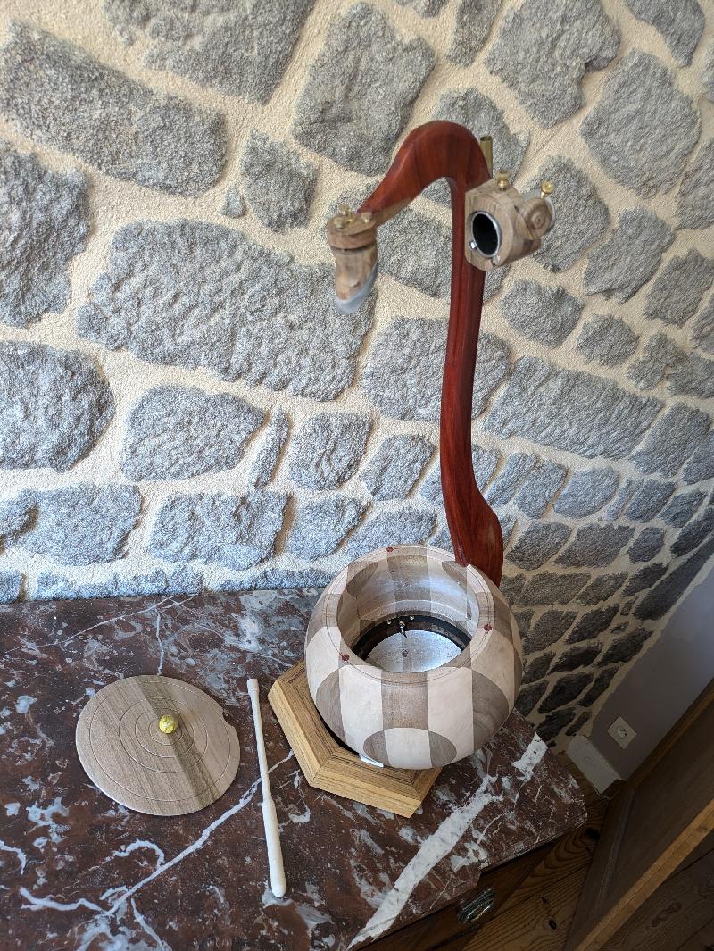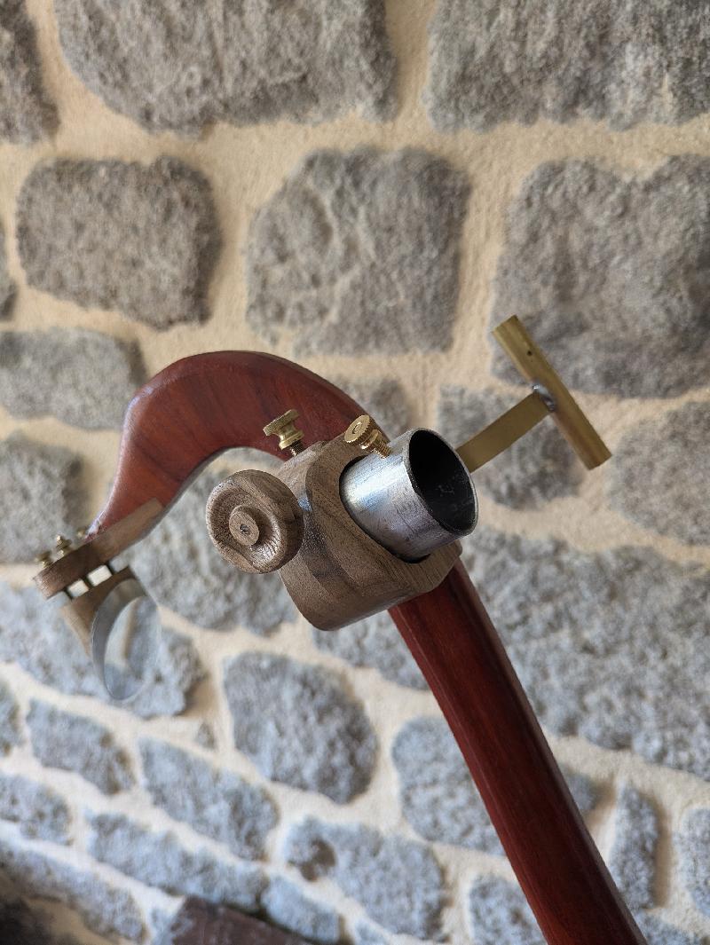Il est principalement en bois, la base en Noyer + Erable + plomb (pour l'équilibrage). Le cou est en bois tropical. Le crayford et l'araignée en Noyer.