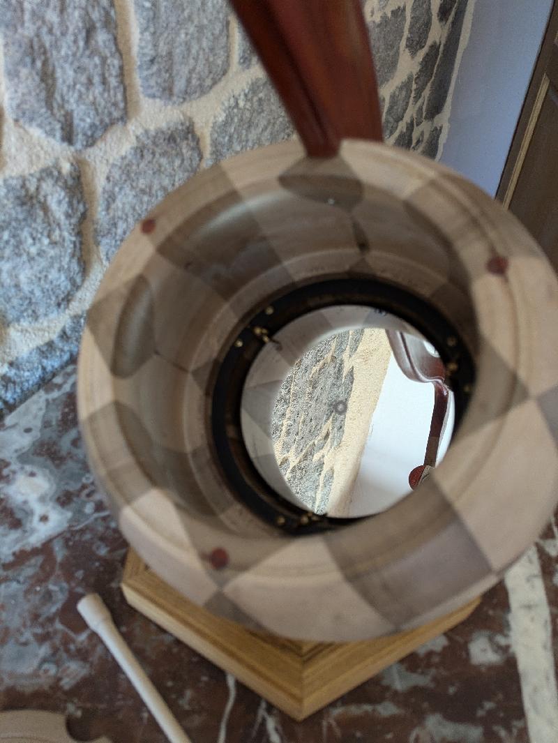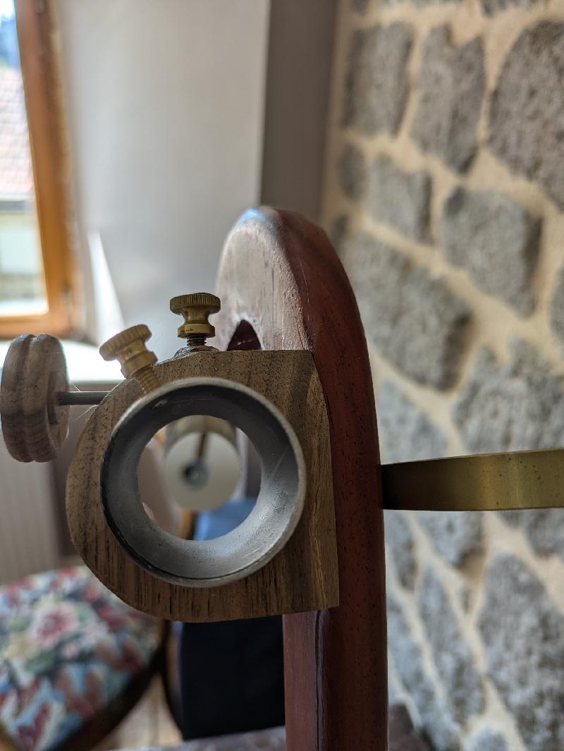 C'est un miroir Parabolique GSO, un porte oculaire Crayford 31.75mm, la collimation se fait par le devant en utilisant un outil fourni avec le télescope (pour simplifier un tournevis en bois). Le miroir est protégé quant il n'est pas utilisé par un cache en Noyer.