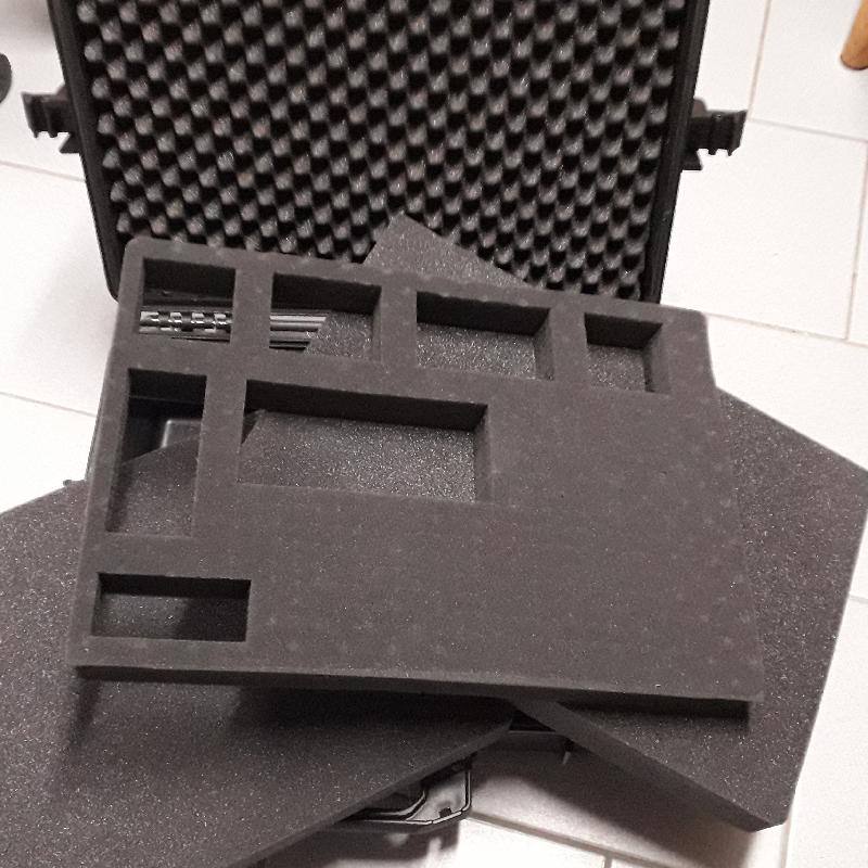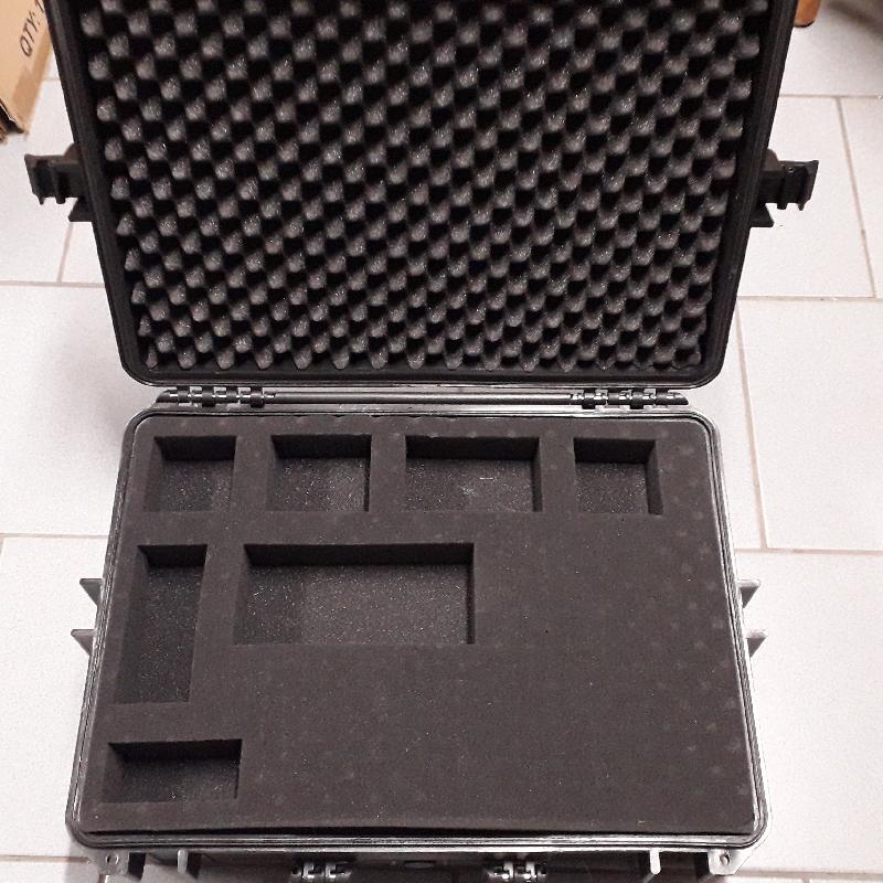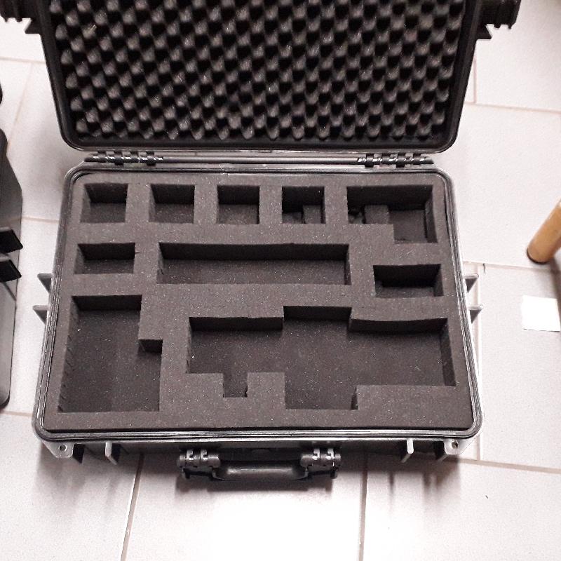 2 valises pour appareil photo, caméra, matériel astronomie. Fermeture à 4 points. Étanche. Volume de 35 litres. En polypropylène. Matériau très très solide. 1 Insert en mousse avec une structure en forme de picots. 1 Insert en mousse avec une structure en petits cubes (déjà utilisée. 2 Inserts en mousse lisse. Épaisseur du rembourrage : env. 4 cm chaque. Dimensions totales (LxlxH) : 56 x 42 x 21 cm Dimensions intérieures (LxlxH): 50 x 35 x 20 cm Volume : 35 litres. Poids : 4,7 kg Prix : 40 € pièce A venir chercher sur place