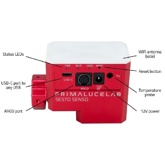 Le SESTO SENSO dispose de trois ports. Un port d'alimentation 12 V qui alimente le moteur et l'électronique intégrée. Il est possible, en utilisant le câble d'alimentation fourni dans le kit, de l'alimenter à partir d'une banale prise allume-cigare. Si vous avez un EAGLE, un câble en option est également disponible pour l'alimenter directement via ce dernier. Un port USB est utilisé pour connecter le SESTO SENSO à un ordinateur de contrôle (ou à l'EAGLE). Un troisième port permet de connecter un capteur de température en option. Cela permet des procédures d'ajustement de la mise au point automatique selon la variation de la température ambiante.