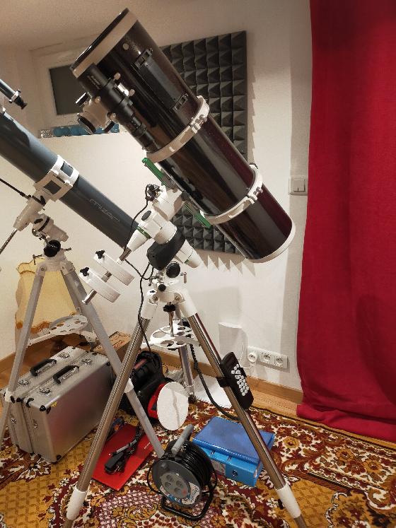 Elle est fournie avec son trépied tubulaire,les 2 contrepoids, une sacoche Geoptik pour la monture,la raquette Synscan (j'ai encore tous les emballages du système goto), un viseur polaire (50 euros) et un éclairage de viseur polaire (38 euros).