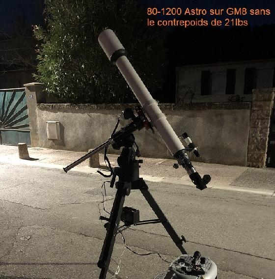 Le contrepoids qui l'accompagne est standard 21lbs (9.5kg), il vient en complément de la barre qui tient seule une lunette lourde Astro M80. (7kg, en photo)