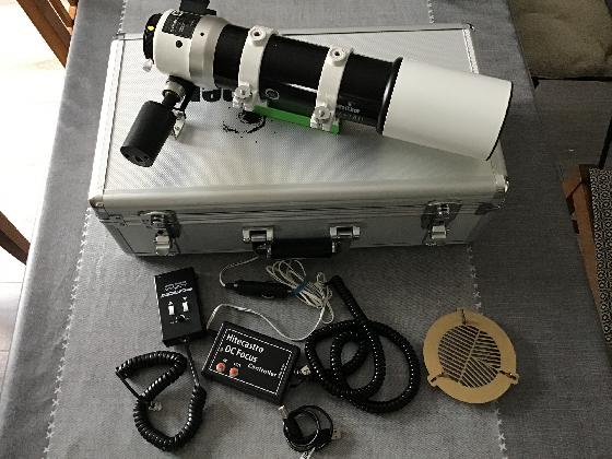 pour cause de non utilisation (utiliser en guidage et solaire visuel) , je vend ma lunette en bon état . Tout fonctionne parfaitement , installé dessus un Accufocus (avec raquette) et un boîtier de commande Hitecastro usb qui permet aussi un contrôle manuel mais surtout par pc . Un masque de Bathinov , une bague vissante M48 permettant de gagner un peu de back focus et malette .