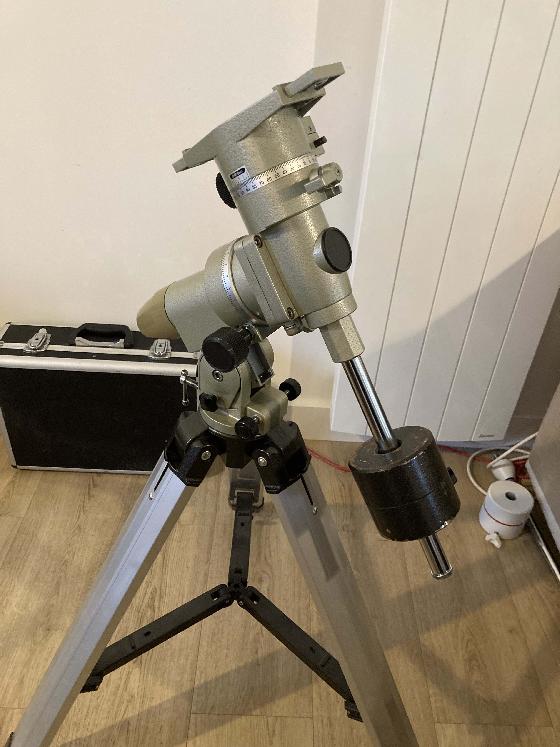 Je vends cette monture avec son trépied en aluminium avec niveau à bulle et plateau triangle, pour passer à une EQM 35 Pro. (Le tube n’est pas à vendre).