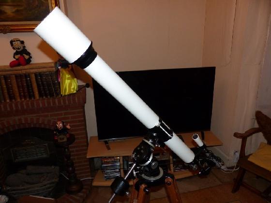 il s'agit d'une construction personnelle à partir d'un objectif Perl Vixen 102 mm en f10, acheté d'occasion, monté avec son barillet de collimation sur un tube PVC avec bafflage interne (5 anneaux, peinture interne noire mat), le tout relié à un porte-oculaire double vitesse de marque William Optics. Sur l'ensemble, deux anneaux et prisme vixen 33 cm.