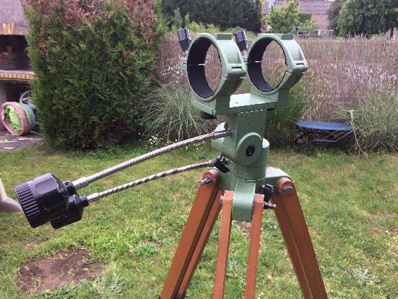 Je vends la monture de la pentax citée plus haut suite au rachat d'une lunette et d'une monture. Monture très légère environ 3/4 Kg facilement transportable, en bon état. La fabrication n'a rien avoir avec les montures actuelles skywatcher l'ensemble des entrainements sont en bronze très solide. Elle était prévu pour porter la J80 soit 3kg avec son bras levier. Elle est fournie avec des anneaux de 80mm et deux flexibles pour les mouvements fin, trépieds bois et possibilité de rajouter une queue d’aronde dessus les anneaux. Deux têtes de vis ont le plastique de cassé ( uniquement esthétique, pas de problème d'utilisation) remplaçable par des vis standard. Idéal pour installation rapide.