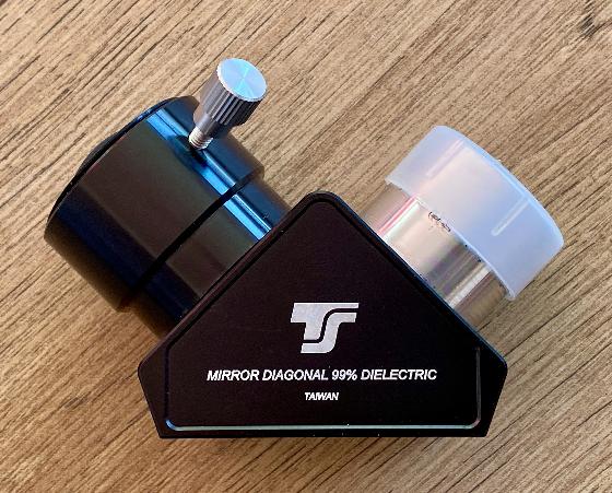 Livrée avec anneaux et queue d’aronde au format Losmandy et un renvoi coudé spécifique (à tirage court) pour faire du visuel avec des oculaires en 1,25’’ (mais ce n’est pas la destination première de cette lunette).