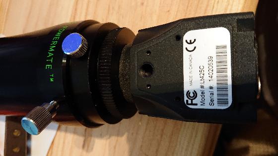 L'ensemble lunette + correcteur donne un instrument d'une longueur focale de 250mm avec une ouverture de 3.7 ; le champ de capture est d'environ 5 x 3° en APS-C et 8 x 5° en FF. Dans cette configuration, le focuser est à peine sorti du tube ce qui permet d'utiliser des boîtiers APN assez lourds sans engendrer trop de contraintes sur le Crayford.