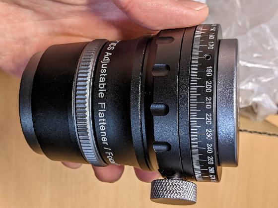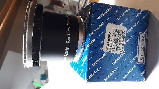 Réducteur de focale Takahashi x0.73Prix: 280€Sommele 03-03-2022 par Aldebaran66Utilisable sur FSQ85 ou 106. Le réducteur a été acheté d'occasion avec une FSQ85 en 2017 (vendue depuis quelques mois) . Je m'en suis servi pendant quatre ans sans remarquer un petit défaut présent sur la lentille côté caméra. Elle comporte une fine rayure circulaire à 5 mm du bord sur environ un tiers du cercle (voir photo 2 en gauche en bas). Cette rayure n'a aucune conséquence sur la prestation optique. Voir mes photos dans la galerie :