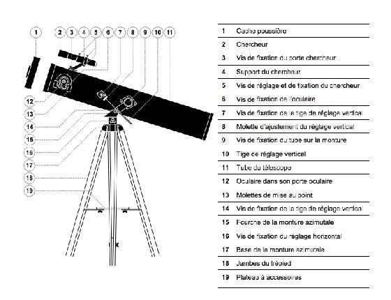 Construction optique : type Newton. Diamètre du miroir en 114mm. Focale en 900mm. Monture : Azimutale. Trépied Aluminium inclus. Hauteur max en 135cm. Oculaire Plössl 25mm. Coulant 31,75mm. Chercheur 6x30mm.