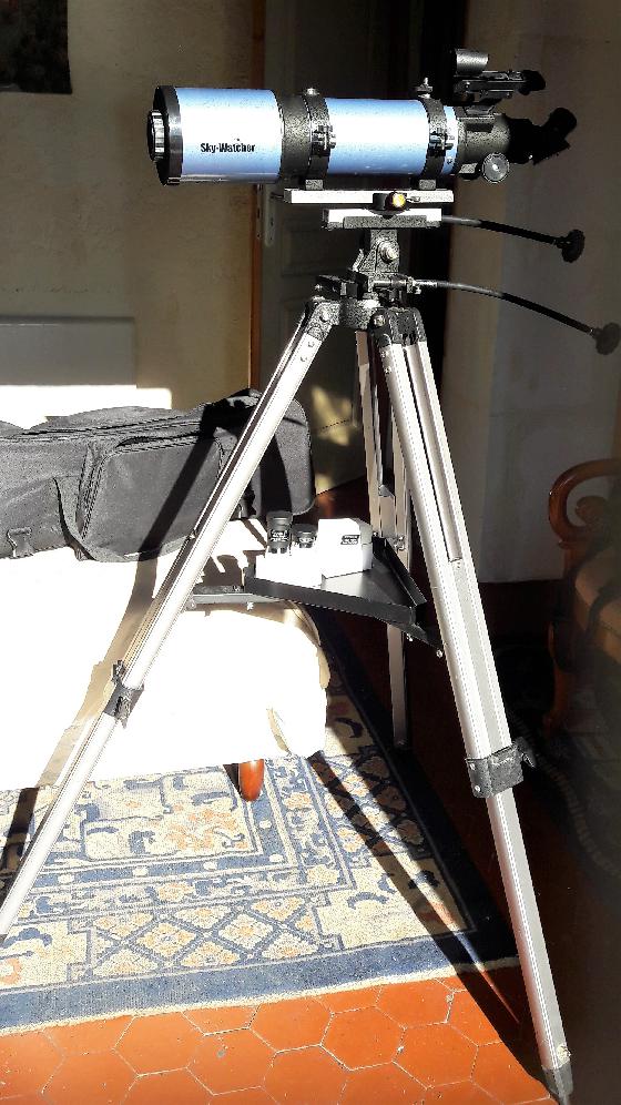 Alpes-Maritimesle 03-11-2017 par CosmusCette lunette achromatique est fournie avec monture AZ sur trépied alu réglable, modifiée pour simplifier l'installation du tube sur la monture, par ajout d'une platine femelle Baader, type Vixen, sur la monture et d'une queue d'aronde fixée sur les 2 colliers de la lunette, ce qui la rend aussi compatible avec tout autre monture standard.