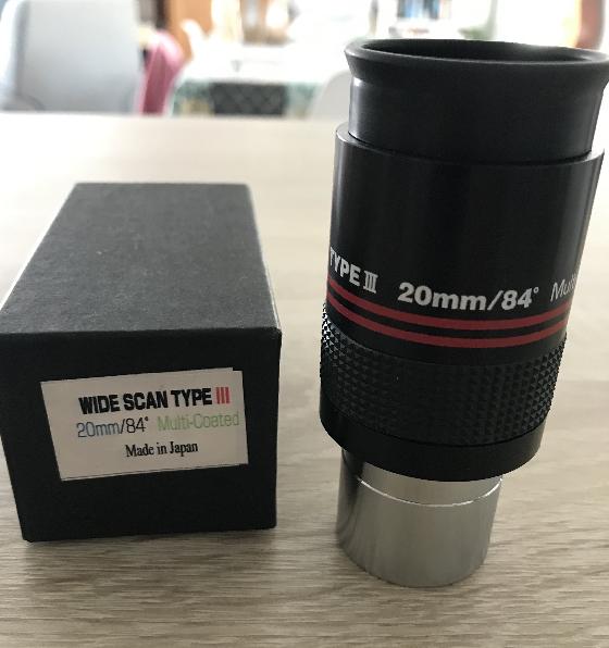 Oculaire grand champ de 65°, fabriqué au Japon, coulant 2" et 1.25", relief d'oeil 20 mm.