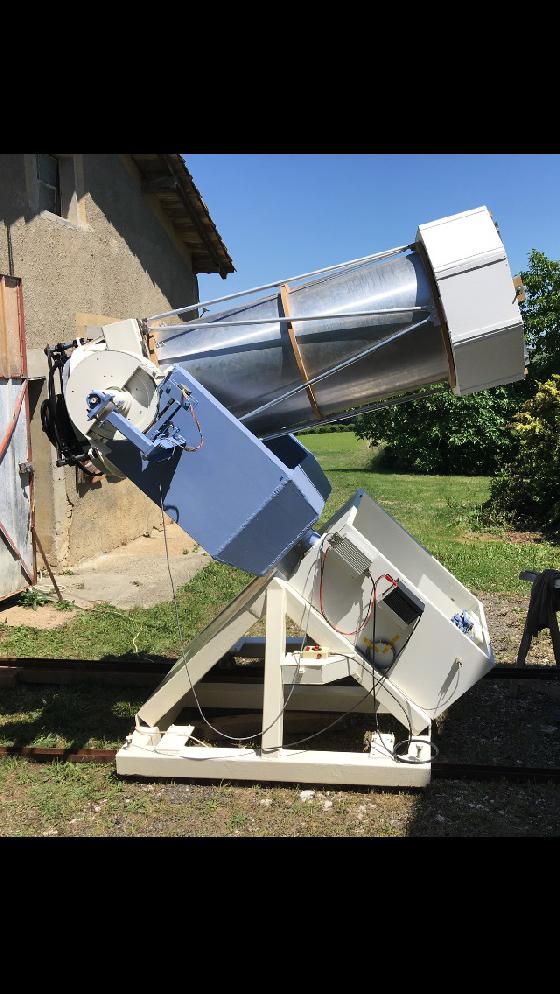 Monture équatoriale à fourche, pilotée par FS2. Masse de l'ensemble, environ 500kg. Des détails mécaniques seraient à revoir pour une utilisation en astrophotographie, CCD. Photos du ciel prises avec téléphone disponibles.