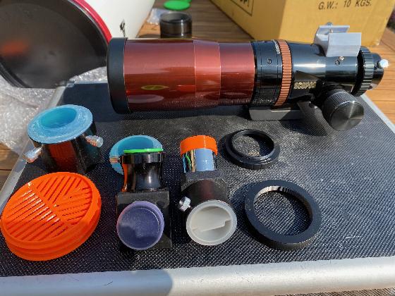 Il est fourni avec un filtre solaire pleine ouverture (Médas), le renvoi coudé, un tube allonge et la caisse d’origine.