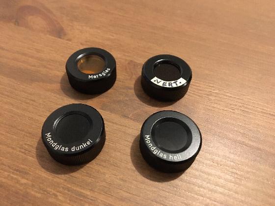 4 filtres pour l'observation visuelle qui se vissent sur les oculaires type H , O Zeiss : 2 filtres gris neutres ,1 rouge , 1 vert