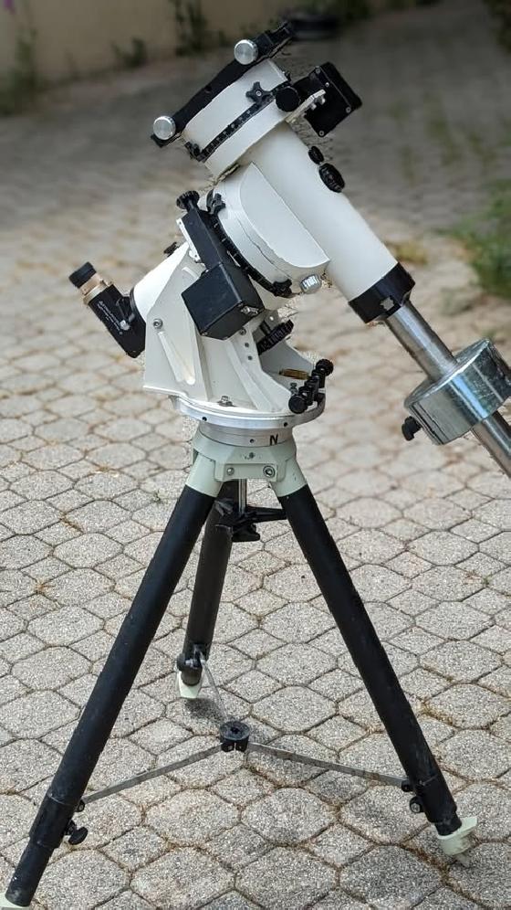 Equipée d'un trepied alu ( type EQ6), et d'une colonne acier si besoin.