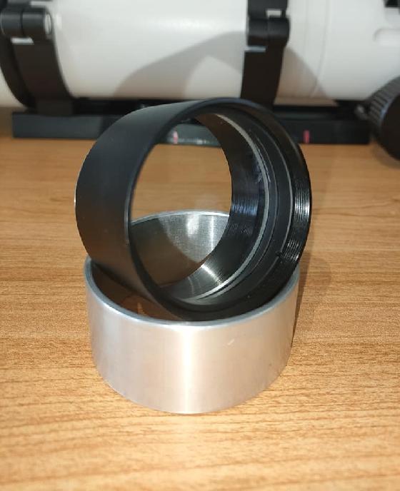pour ceux qui disposent du focuser TS-Optics RPA 3.7 pouce, celui que j'avais sur ma TS 130 F7: https://www.teleskop-express.de/shop/product_info.php/info/p7717_TS-Optics-PHOTOLINE-130-mm-f-7-FPL53-Triplet-Apo---3-7--Focuser.html , j'ai fait réaliser sur mesure, une bague pour directement insérer le réducteur Riccardi 0.75 dans le filetage femelle du focuser, sans cela, il est impossible de pouvoir utiliser ce réducteur avec cette lunette car l'empilement des bagues à partir du filetage M68 est trop long!