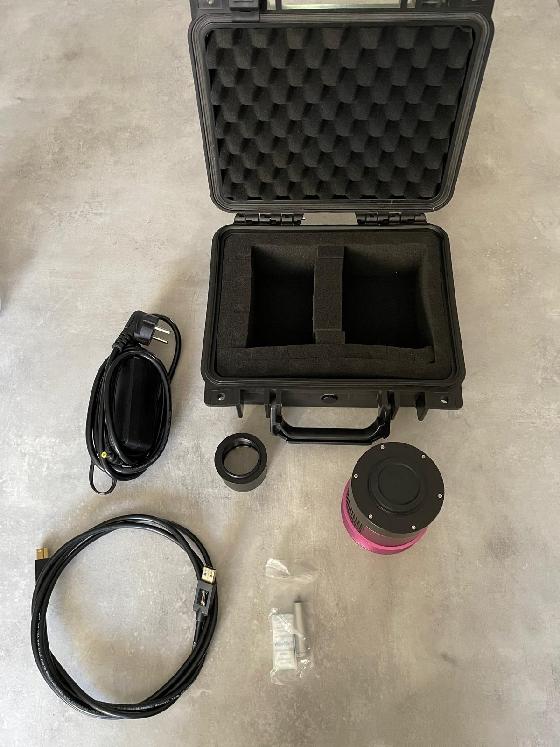 Elle est accompagnée de son pélicase, son alimentation, un câble USB3 changé car celui d'origine s'est abîmé à la base, un tube de dessiccant fourni, l'adaptateur coulant M48.