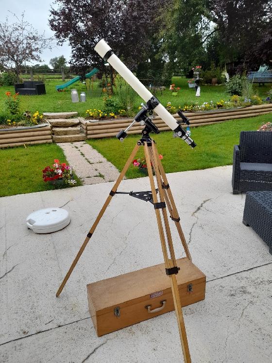 La lunette est complète avec son renvoi coudé d'origine, oculaire, boite de rangement, chercheur et monture. Depuis la photo, le trépied a été rénové pour retrouver la couleur naturel du bois. L'optique est propre, au niveau cosmétique quelques traces sur le tube du également a son âge. Marque royal oblige les images avec son bonne pour le diamètre. L'optique a été contrôlé sur un banc.