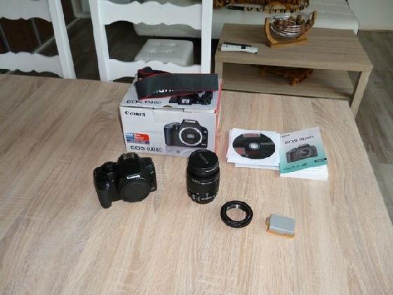 Boitier 1000D défiltré partiel, avec objectif EFS 18-55, batterie supplémentaire, chargeur, bague T2, CD d'installations, sangle, carte mémoire 4GB.