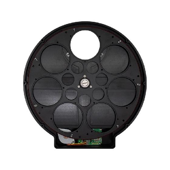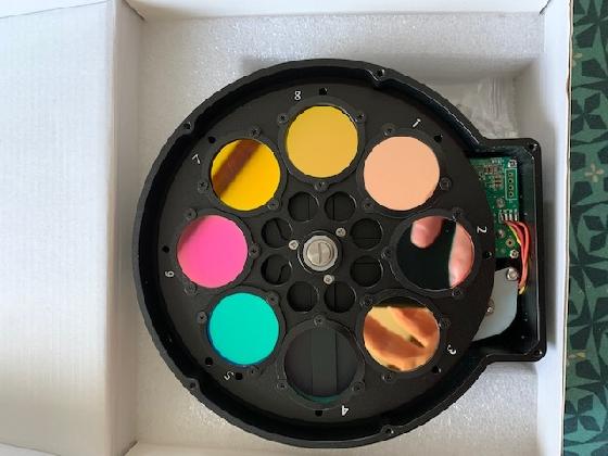 Les filtres suivants (non montés) sont fixés dans la roue: Rouge, Vert, Bleu, Luminance, H alpha 7nm, Oxygène III, Soufre 2.