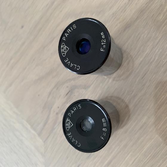 je vends deux Clavé 8mm et 12mm tout chromés et au coulant 27mm. Attention, ils ne sont pas impeccables, il semble que le doublet collé au baume du Canada a commencé à se décoller un peu. Cela ne se voit pas en observant sur le 12mm, mais un peu sur le 8mm. Donc plus pour de la collection que de l’observation scrupuleuse.