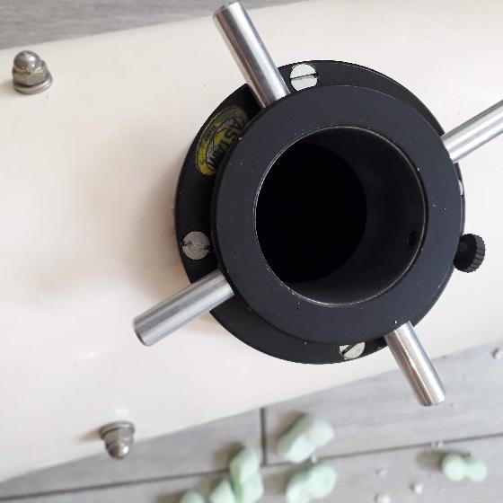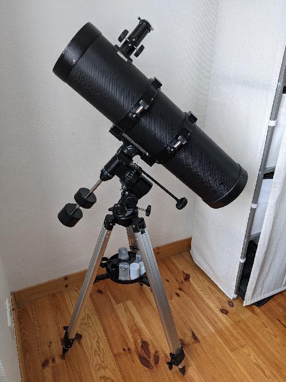 Il est en fibrecel avec miroir 150 f/5 le porte oculaire est à cabestan,il accepte les oculaires 1"1/4;pour les gros cailloux il faut une bague que je n'ai pas.les optiques sont propres et supporte les fort grossissement (250x et 300x).Quelques petits éclats de peinture sur le support aluminium.