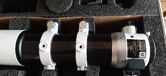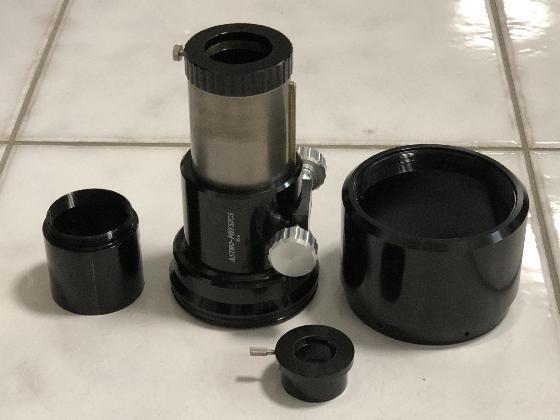 je lui ai ajouté un coulant 2", vendue avec son coulant d'origine 31.75. chercheur solaire et filtre pleine ouverture (feuille neuve Astrosolar visuel et photo).