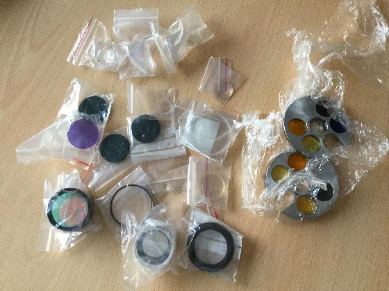 un lot de lentilles de toutes sortes : simple, doublet, divergentes convergentes. Prismes, roues à filtre, filtres.