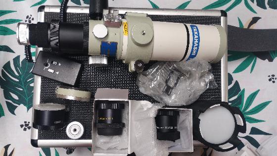 Hautes-Alpesle 03-12-2024 par christine LaulhereL'ensemble de deux lunettes en une est composée d'un tube complet FS-60CB. Son objectif peut se dévisser et l'on visser à la place le kit objectif de conversion FC-76DC. Un réducteur de focale x 0.72 permet de passer de l'ouverture 6 à 4.4 pour la petite lunette et de 7.5 à 5.4 pour la deuxième. Un renvoi coudé Takahashi et une barlow 2x font partie du lot.