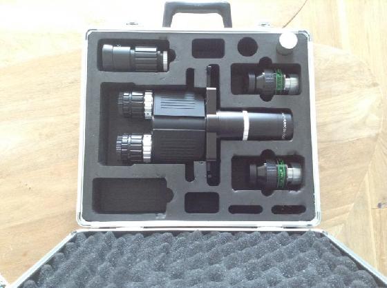 Il a un pare-soleil coulissant, un berceau de roche d'origine, une belle mise au point de 2 ", très lisse et robuste, et j'ai aussi (ajoutez 250 €) un correcteur de vision TV 0,8x d'origine qui réduit jusqu'à une distance focale de 1000 mm (pour atteindre une focale de 700mm f/7) et sa mallette de transport desserrée. Spécimen magnifique ! Il montre des images vraiment sèches et contrastées sans chrominance !