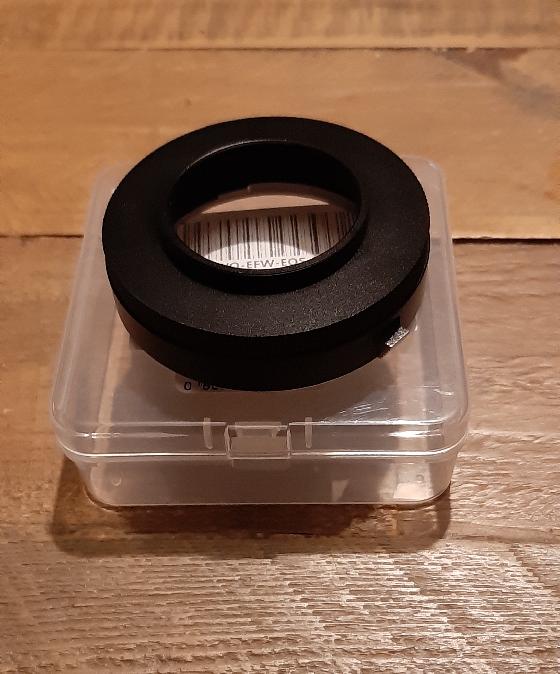 - Bague ZWO Canon EOS courte : permet d'ajouter une roue (ou tiroir) à filtres entre l'objectif et la caméra. Tirage 17.5 mm. Prix neuf 59 €, vendue 30 €.
