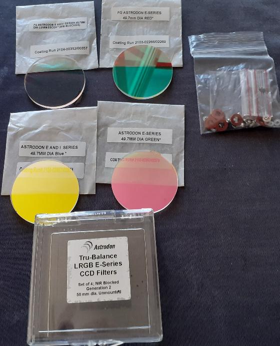 jeux de 5 filtres astrodon 2 pouces non montès LRGB +HA 5nm TRU-BALANCE dans ces boites d 'origines en parfait état plus le sachets de rondelles et visses