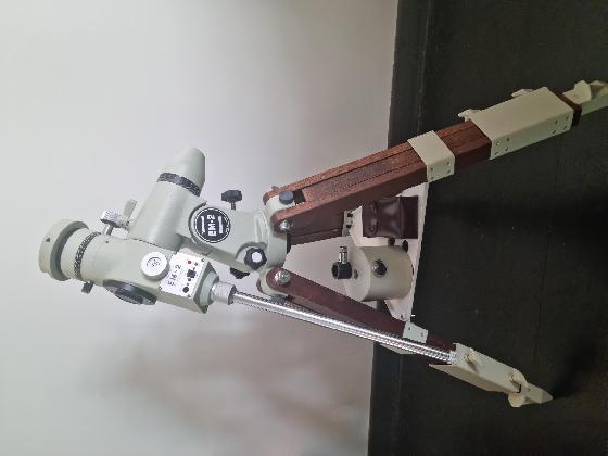 Monture en bon état cosmétique et de fonctionnement. Par contre, il y a quelques éclats de peinture sur le trépied et les contrepoids sont en état moyen (pas de chocs, juste une peinture à refaire).