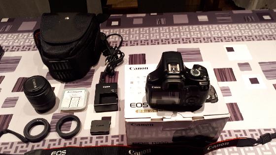 Appareil photo Canon EOS 1100D défiltré total avec sa courroie, sa boite d'origine et ses notices.