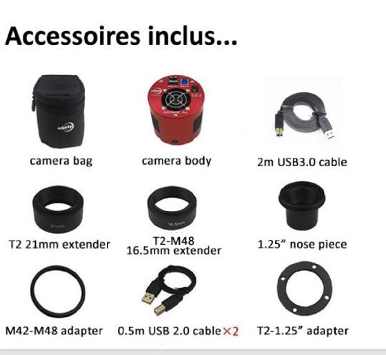 Son sac, un câble usb3 bague T2 21mm une T2 M48 16,5 un adaptateur M42-M48, un petit câble usb2 deux petites cales.