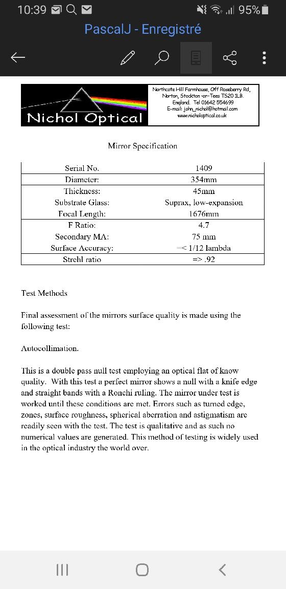 Comme d’habitude avec Nichol Optical, pas de donnée quantitative mais une lettre donnant un Lambda/12 sur la surface (donc L/6 sur l’onde) et un rapport de strehl de 0.92