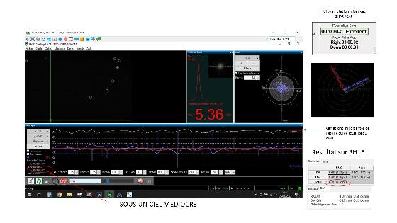 - Contrôle de suivi effectué sous le ciel étoilé. Des perfs à 0,49 RMS et une moyenne de 0,78 RMS sur 3 heures de suivi avec un drift align résultant de 1,5 minute d’arc (malgré des conditions météo peu favorables car nuages en haute altitude et seeing très moyen ce soir là)
