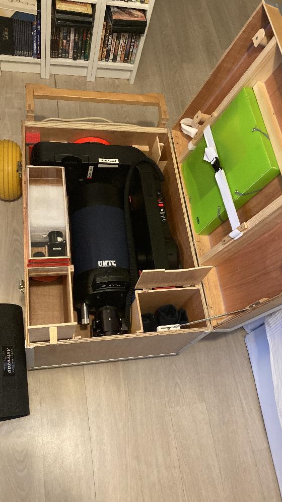 Ce télescope est livré dans une malle de transport en bois, sur roues basse pression, avec rangement incorporé pour accessoires et prise multiple extérieure, et est vendu avec les accessoires suivants :