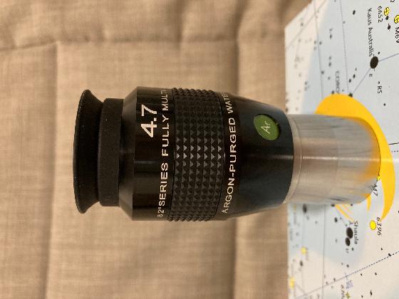 Pour cause de doublon dans ma gamme d'oculaire, je vends un oculaire ES 82° 4,7mm en excellent état, sans défaut, avec bouchons et boite.