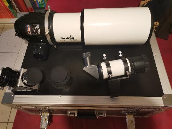 En parfait état optique, mécanique et esthétique, avec chercheur coudé 9x50 (le renvoi coudé est dévissable pour en faire une lunette guide), correcteur de champ 2 lentilles, renvoi coudé 2" et valise de transport.