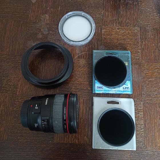 En prévision d'un déménagement, je vends un objectif pour appareil photo Canon EF 24 mm f/1,4 L USM Série 2 + filtre ND 64 + filtre ND 400 filtre anti-UV + pare-soleil.