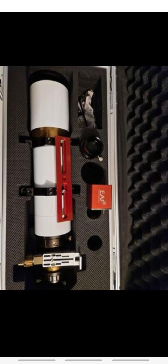 Le télescope est en parfait état et constitue un véritable joyau optique. Les images et leur ponctualité sont impressionnantes aussi bien aux faibles grossissements avec un Nagler 31 par exemple qu'aux forts grossissements. Il dépasse facilement les 200x sans aucune trace de chromatisme. Livré avec un sac de transport et un filtre neutre pour protéger l'optique.