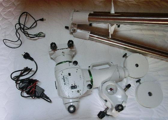 En très bon état, l'offre comprend l'interface (EQMOD USB Direct) d'une valeur de 33€ et l'alimentation secteur d'une valeur de 36€ (prix à l'achat de 1750€). Le trépied et les contre-poids sont évidemment inclus (mais contiennent des marques d'usures sans repercussion sur leur fonctionnalité)