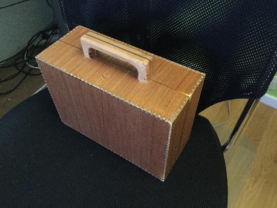 La mallette est neuve, fabriquée par moi, en bois (contre plaqué de 4mm pour l'extérieur léger, rigide et solide, du cerisier pour le fermoir et du sycomore pour la poignée).