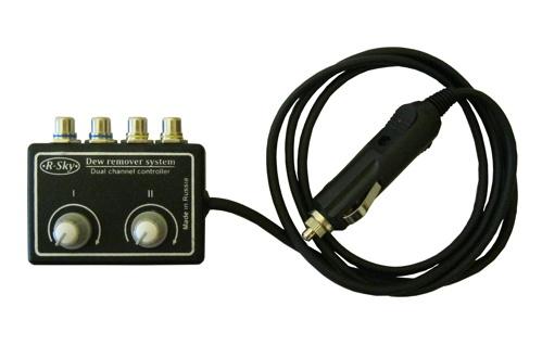 suite à changement de matos, vends boîtier de contrôle bi-canal 4 prises R-Sky, état neuf jamais servi, prise allume cigare 120cm + résistance chauffante 20cm 4W pour chercheur/lunette guide 60mm ou oculaire en 50,8mm.