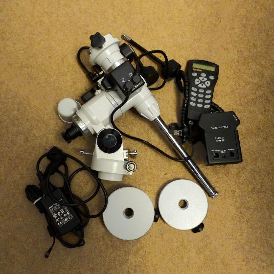 Il y a avec la monture, le boitier de commande, la raquette, le support de raquette, les molettes de commandes manuelles, le viseur polaire, l'alimentation 12v/2A et 2 CP 1.5kg et 3.5kg.